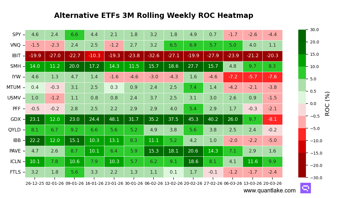 Momentum leadership across the alternative ETFs we track remained concentrated in clean energy and semiconductors, while laggards extended in gold-linked and crypto-linked sleeves. Versus the prior week’s cleaner, growth-tilted rotation, this week showed a sharper loss of breadth and a more one-sided deceleration. The tape stayed dispersed, but dispersion increasingly reflected downside velocity rather than upside follow-through.