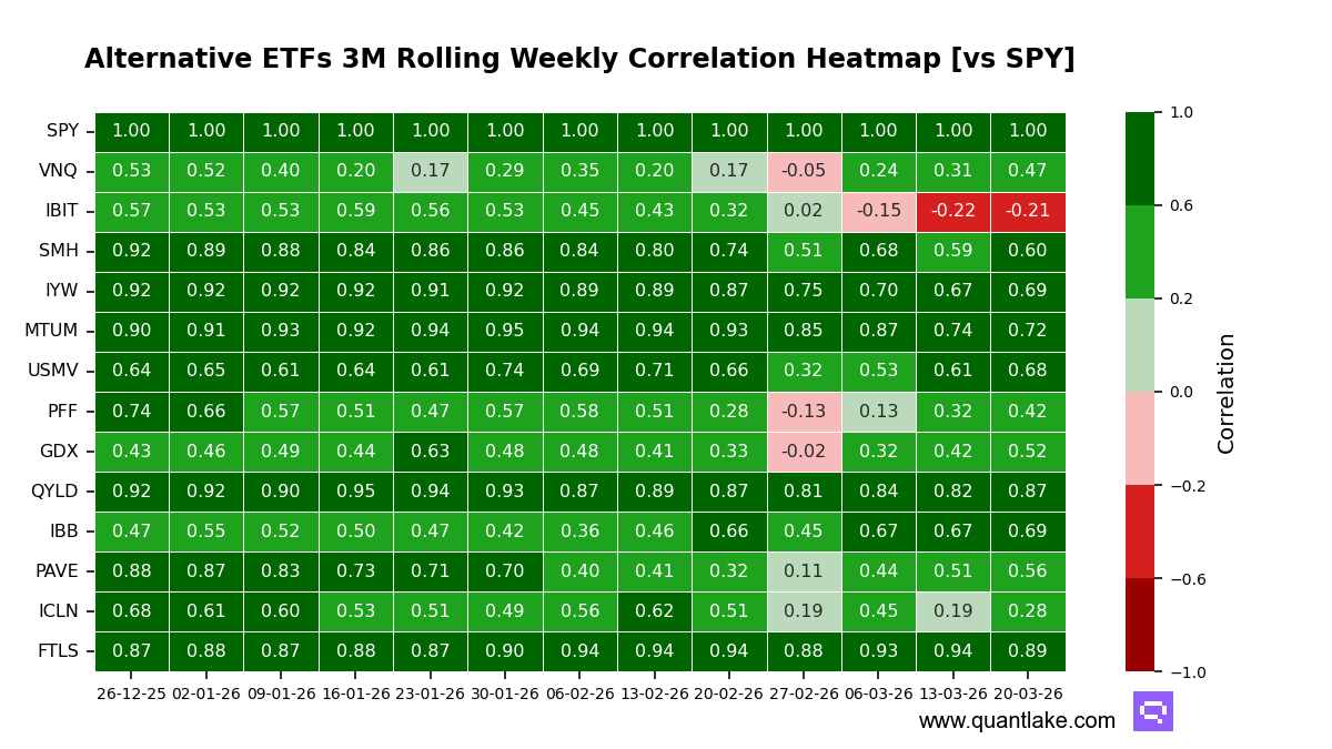 Attribution lens: Clean Energy’s low correlation versus its 1-year mean and positive alpha contribution read as decoupling, with diversification quality improving as momentum stays firmly positive. Semiconductors also showed correlation below its 1-year mean, but its higher absolute linkage to the broad equity benchmark keeps it closer to a beta-adjacent expression. Gold Miners moved the other way, with correlation above its 1-year mean, signaling convergence even as momentum turned sharply negative. Bitcoin’s correlation turned negative versus its positive 1-year mean, but the -25.1-point alpha contribution and unstable momentum profile kept it isolated rather than a reliable diversifier.