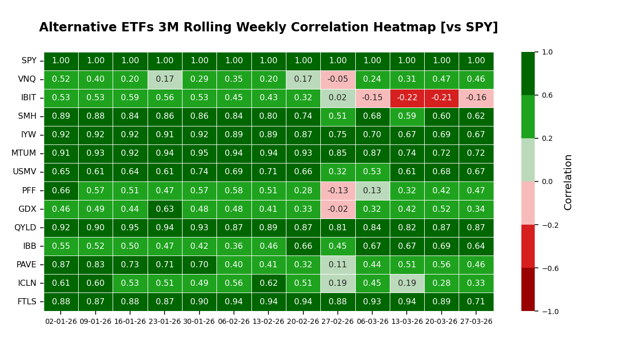 This week, breadth remained weak: 2 of 14 ETFs posted a higher three-month momentum reading, and one fund flipped negative. VanEck Gold Miners led the week’s momentum shifts with a +2.1-point move, while Global X U.S. Infrastructure Development and iShares Preferred and Income Securities were essentially flat at +0.1 and -0.2 points. The sharpest deteriorations were VanEck Semiconductor at -6.0 points, iShares U.S. Technology at -5.6 points, and iShares Bitcoin Trust at -4.3 points; Vanguard Real Estate flipped negative.