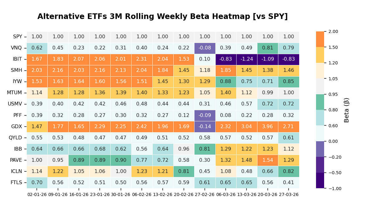 Momentum leadership across the alternative ETFs we track is narrow and increasingly defensive. Clean energy and infrastructure are the only clear positives, while crypto and growth proxies remain at the back. Relative to the prior week’s more one-sided deceleration, this week showed a small pocket of stabilization but no broad reset. Dispersion remains high, concentrated in a few large downside outliers rather than broad upside participation.