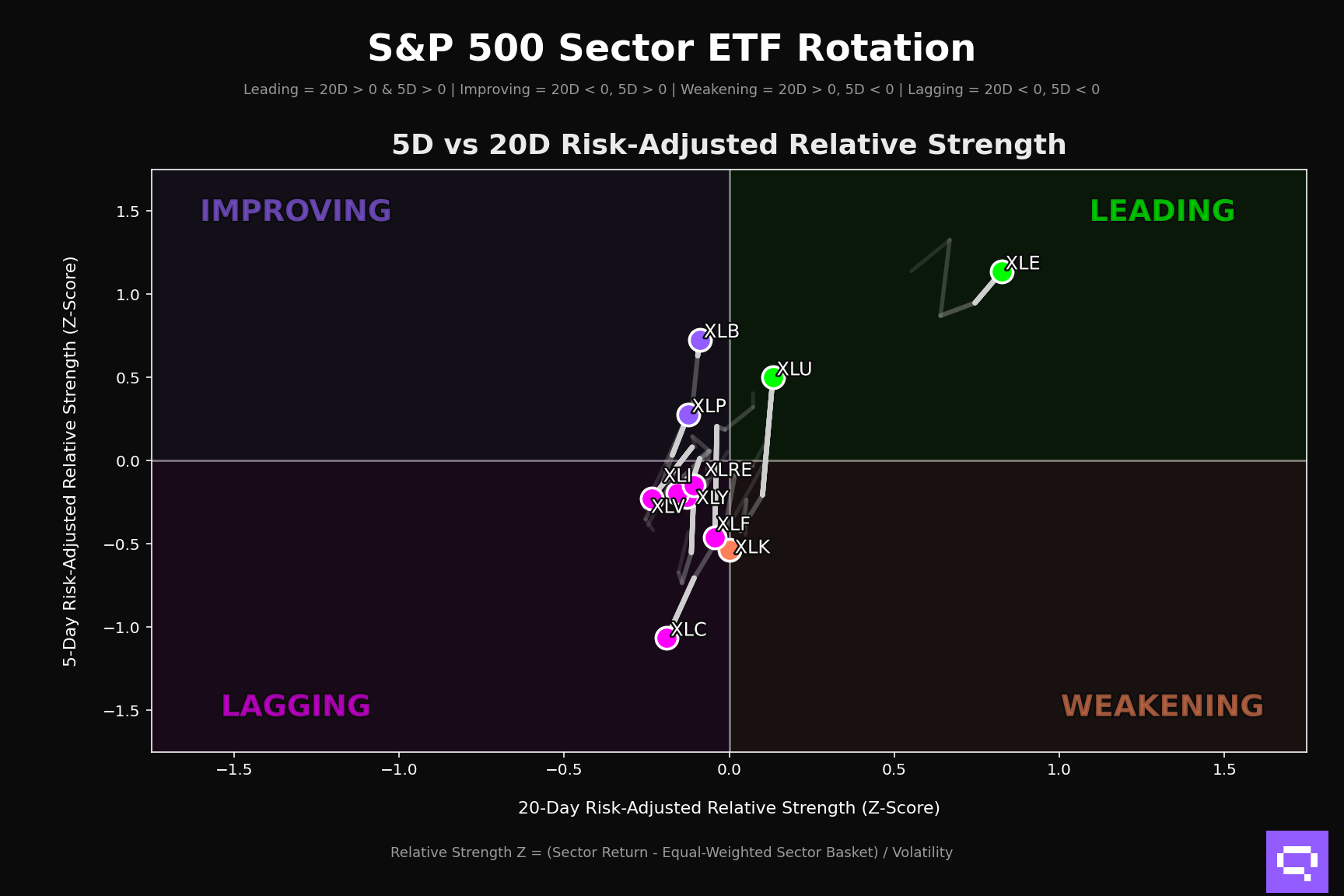 Each sector is evaluated using 20-day and 5-day risk-adjusted relative strength (Z-scores) versus the equal-weighted S&P 500 sector basket.