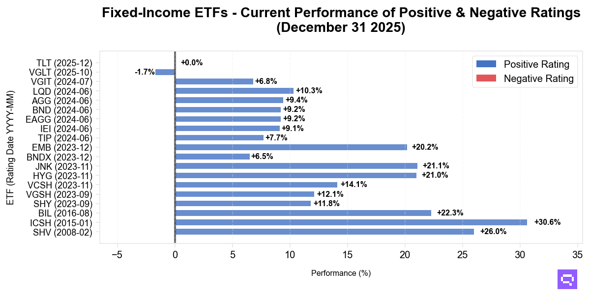 Fixed income ETFs delivered mixed results in December. Short-duration and ultra-short bond exposures, including iShares Short Treasury Bond (SHV) and BlackRock Ultra Short-Term Bond (ICSH), returned 0.4%. High yield corporates such as SPDR Bloomberg High Yield Bond (JNK) and iShares iBoxx $ High Yield Corporate Bond (HYG) posted gains of 0.6% and 0.5%. Core aggregate and investment grade exposures, including iShares Core US Aggregate Bond (AGG) and iShares iBoxx $ Investment Grade Corporate Bond (LQD), declined by 0.3% and 0.7%. Long-duration Treasuries underperformed, with iShares 20 Plus Year Treasury Bond (TLT) down 2.7% and downgraded to Negative. This contrasts with last month, when long-duration exposures held a Positive rating.