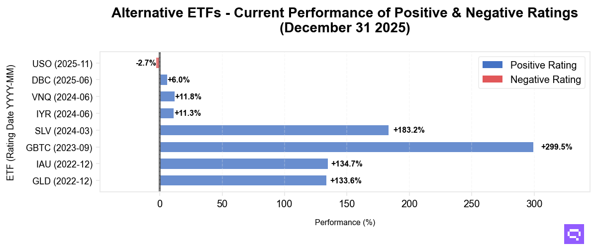 Alternative ETFs saw divergent performance in December. Precious metals maintained strength, with iShares Silver (SLV) surging 25.8% and gold ETFs (IAU, GLD) each up 2.2%. Grayscale Bitcoin Trust (GBTC) declined 3.7%, a narrower loss than in November. Real estate exposures, including Vanguard Real Estate (VNQ) and iShares US Real Estate (IYR), fell 2.2%. Broad commodities (DBC) were flat, while United States Oil Fund (USO) slipped 2.7% and remains rated Negative. Compared to last month, precious metals extended their lead, while real estate reversed direction.